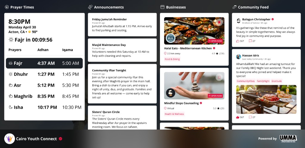 Instead of juggling WhatsApp groups, event pages, donation sites, and prayer time apps, everything lives in one place. Built by UMMA Foundation, powered by the ummah.